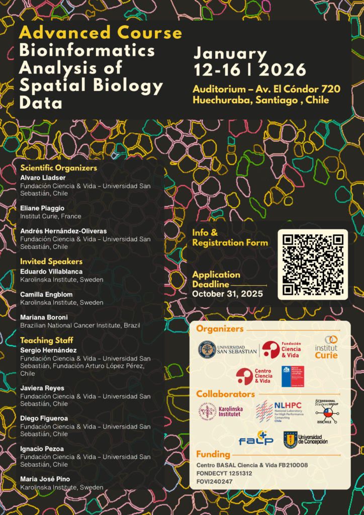 Este curso es organizado por Fundación Ciencia & Vida – Universidad San Sebastián e Institut Curie, y es financiado gracias a Centro BASAL Ciencia & Vida FB210008, FONDECYT 1251312, y FOVI240247.